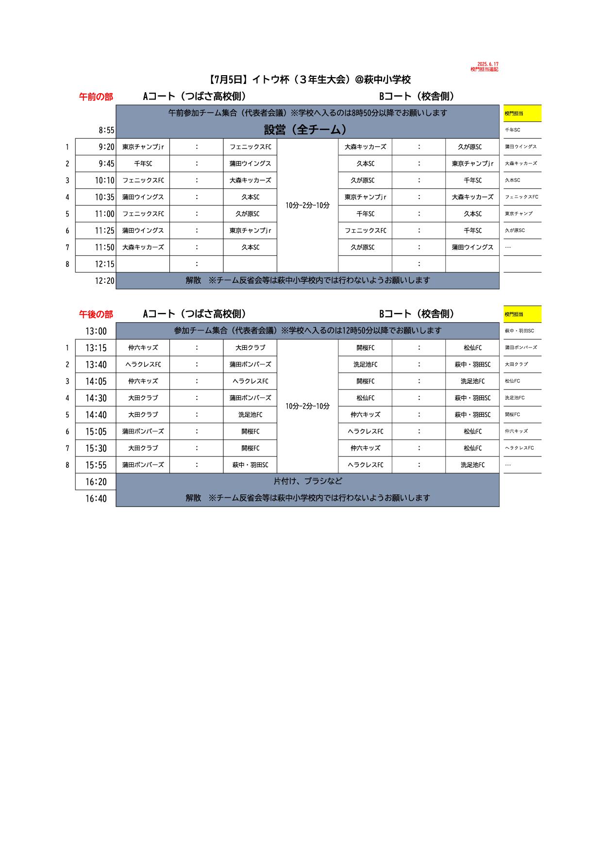 ステータス 終了 7/5 イトウカップ3年 2025年度 7月5日(土)に予定されているイトウカップ3年のスケジュールです。 566791198510416607_イトウ杯3年生20250705-3.pdf