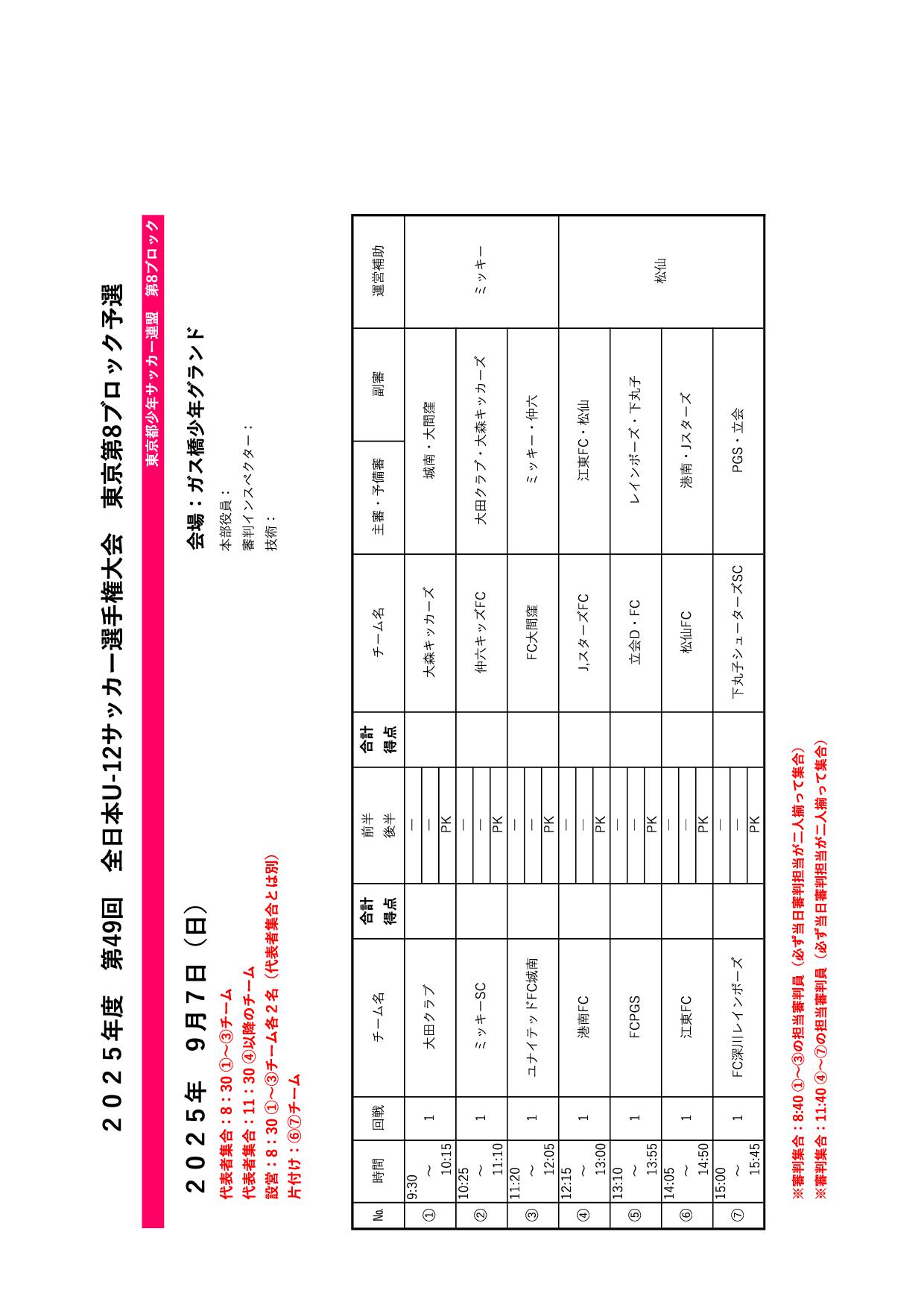 ステータス 終了 9/7 8ブロック全日本予選スケジュール 2025年度 9月7日に予定されている8ブロック全日本予選スケジュールです。 【8ブロック】2025年度全日本カップトーナメント表0713.pdf 0907ガス橋少年.pdf