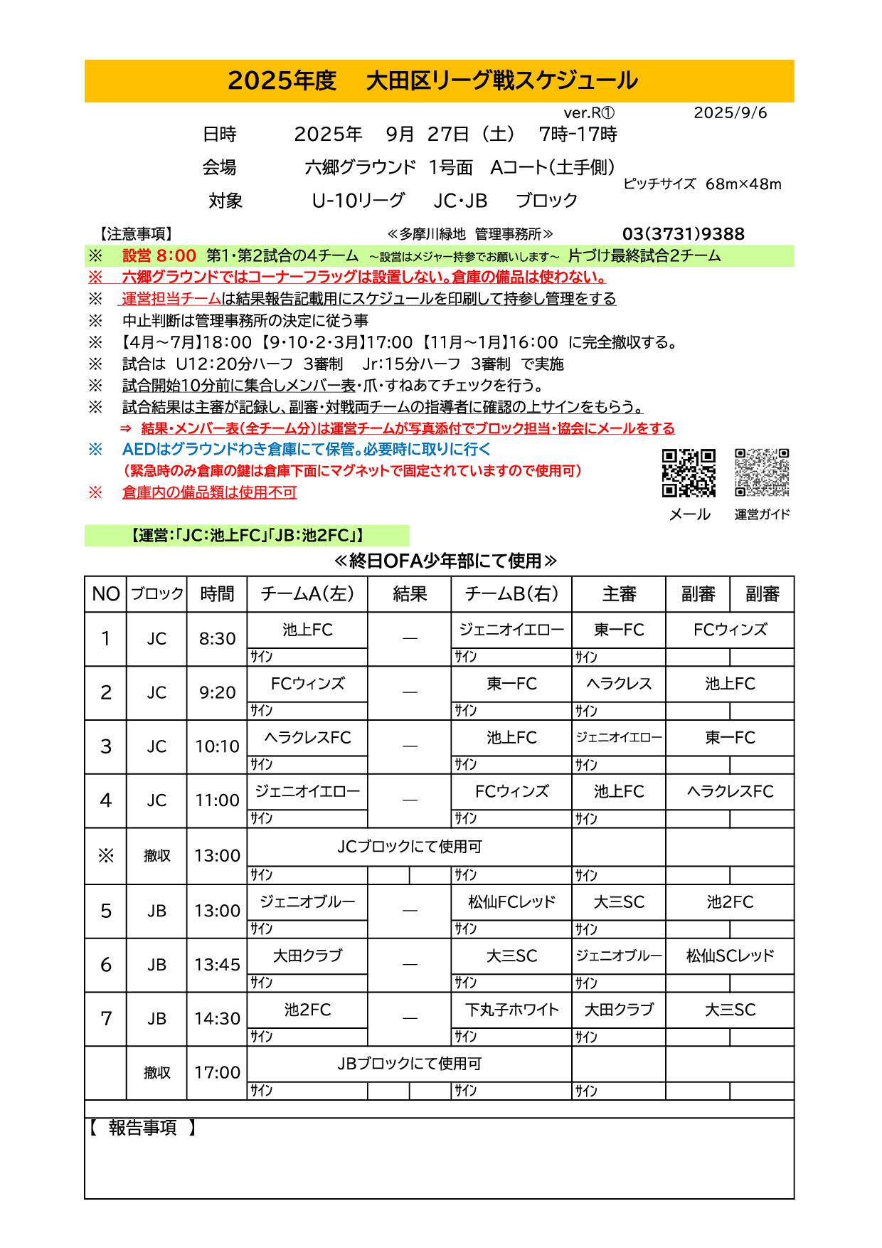 9月27日(土)に予定されている大田区前期U10リーグのスケジュールです。