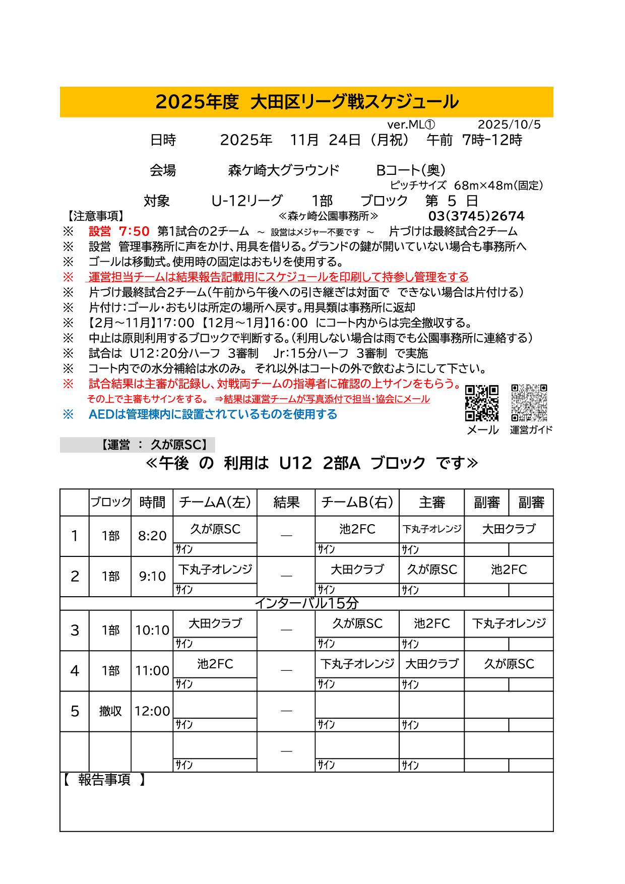 ステータス 終了 11/24 大田区後期U12リーグ スケジュール 2025年度 11月に予定されている大田区後期U12リーグのスケジュールです。 ①2025_1012AM_shouwajima_1部.pdf ②2025_1019AM_MorigasakiS_1部.pdf ③2025_1102AM_MorigasakiS_1部.pdf ⑤2025_1124AM_MorigasakiB_B_1部.pdf ④改訂A_Bプラン2025_1109AM_MorigasakiS_1部.pdf