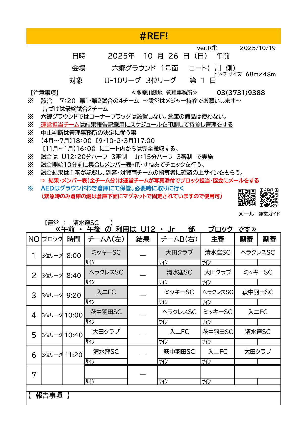 10月26日(日)に予定されている大田区後期U10リーグのスケジュールです。