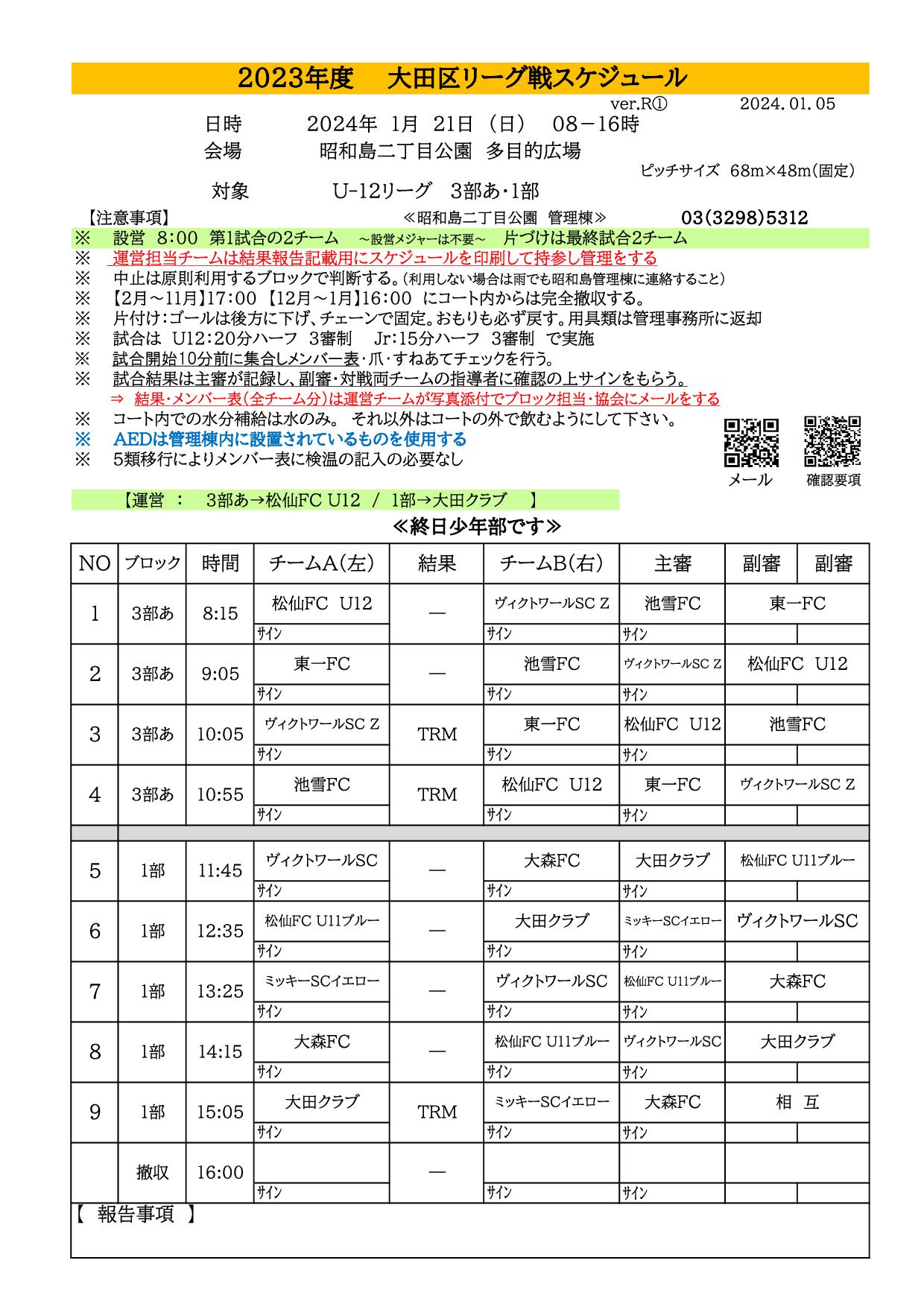 ステータス 中止 1/21 大田区U12リーグ(1部)スケジュール 2023年度 1月21日(日)に予定されているU12リーグ1部ブロックスケジュールです。 ①2024_0121終日_昭和島_3部あ1部.pdf