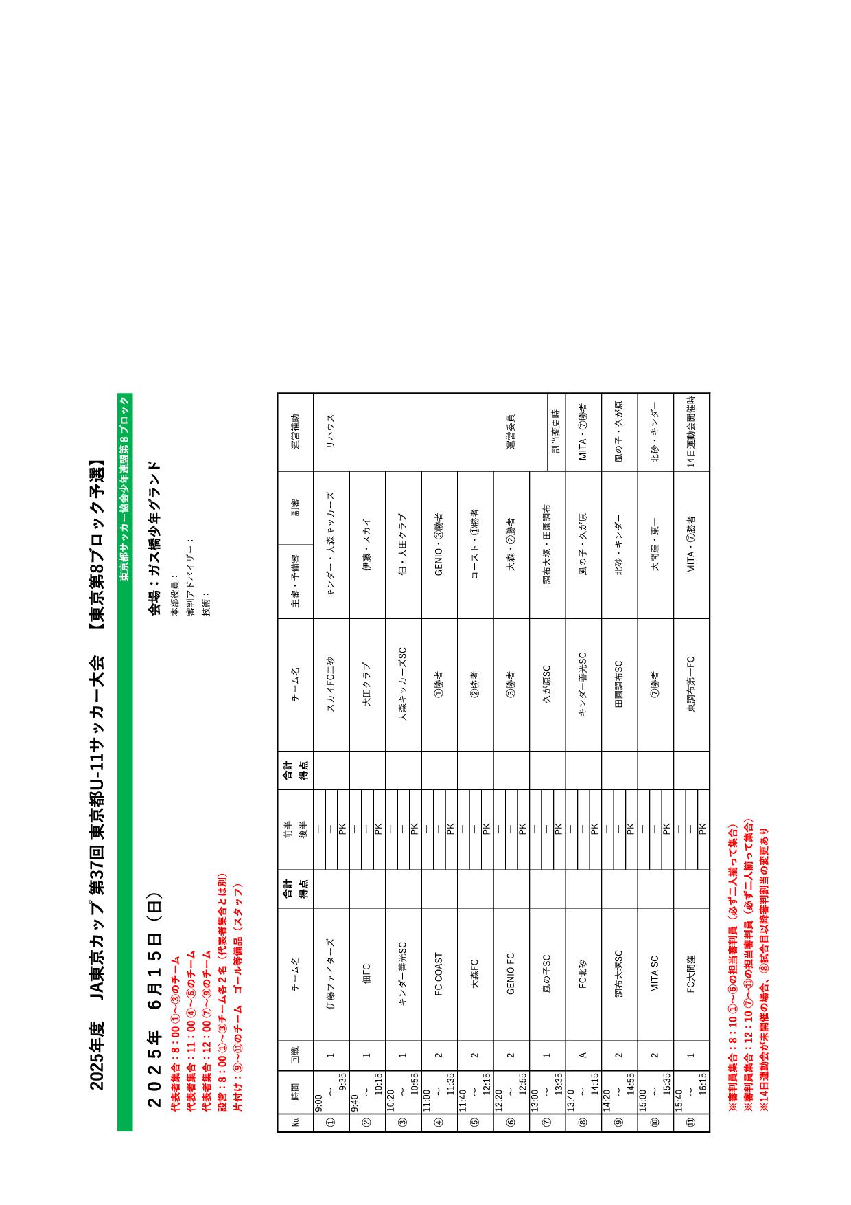 ステータス 中止 6/15 2025年度 8ブロックJA東京カップスケジュール 2025年度 6月15日(日)に予定されている2025年度 8ブロックJA東京カップスケジュールです。 JA0615ガス少年.pdf 2025JAトーナメント表.pdf