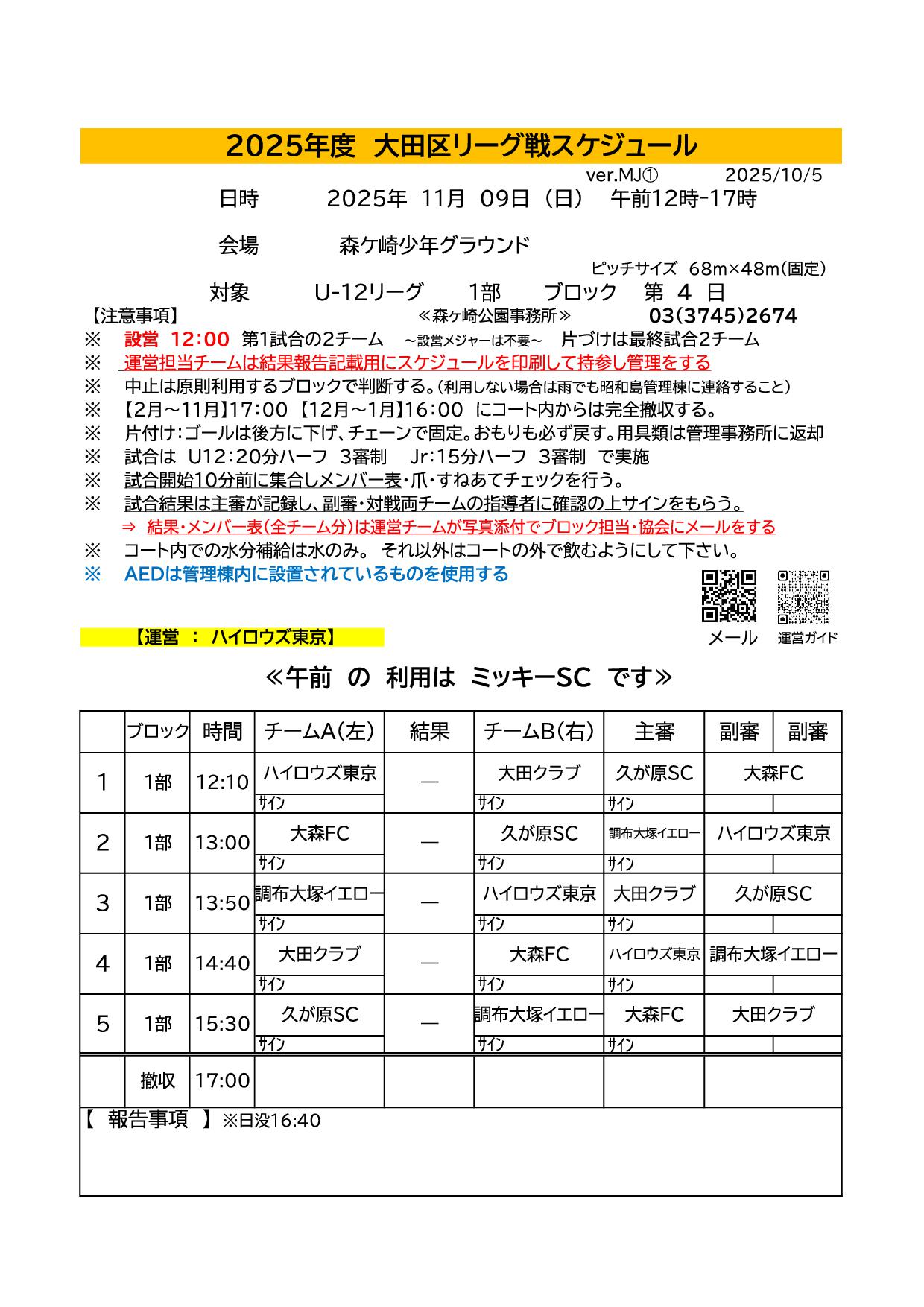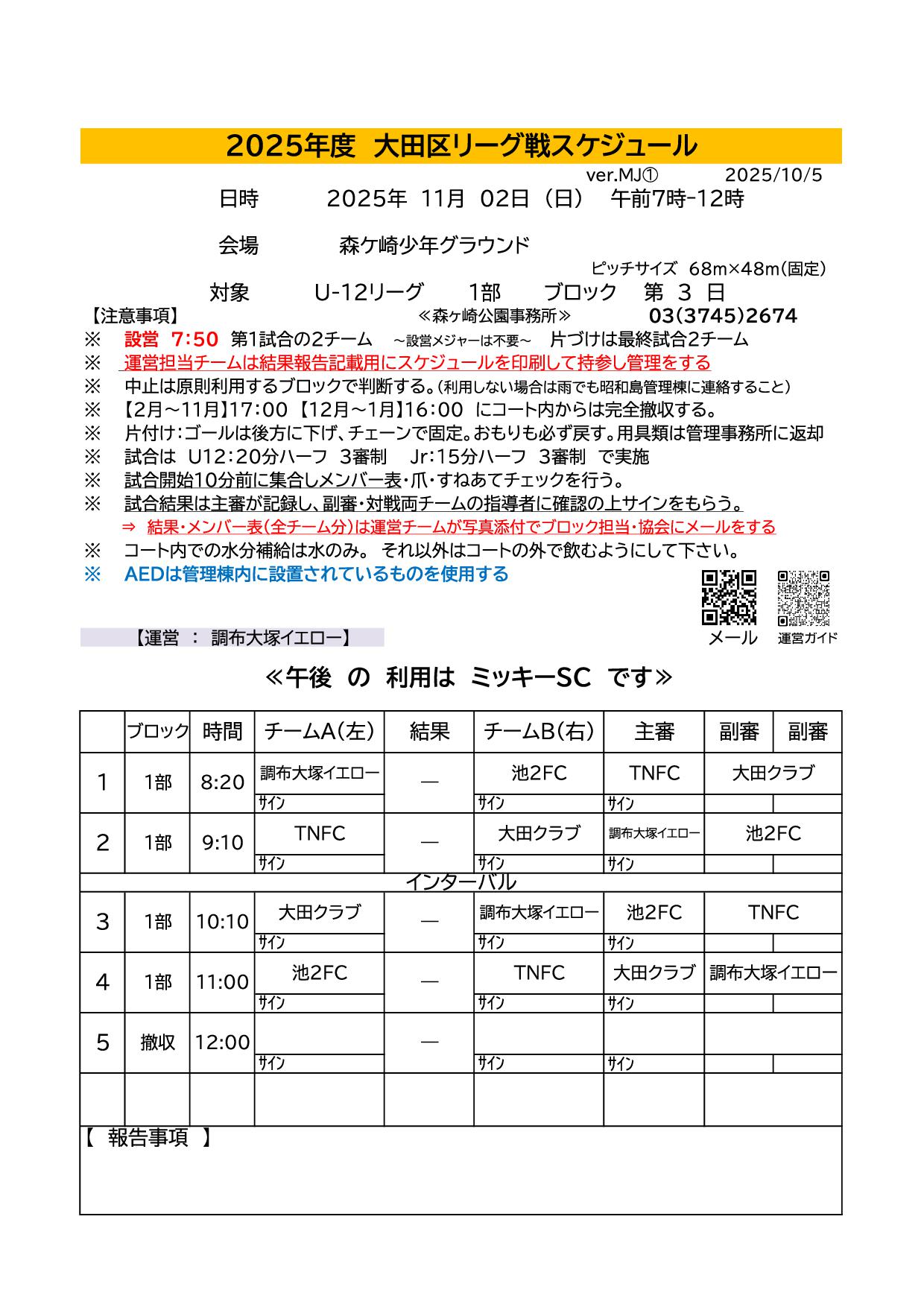 ステータス 実施中 10月 11月 大田区後期U12リーグ スケジュール 2025年度 10月、11月に予定されている大田区後期U12リーグのスケジュールです。※10月は、大田クラブの試合はありません。 ①2025_1012AM_shouwajima_1部.pdf ②2025_1019AM_MorigasakiS_1部.pdf ③2025_1102AM_MorigasakiS_1部.pdf ④2025_1109AM_MorigasakiS_1部.pdf ⑤2025_1124AM_MorigasakiB_B_1部.pdf