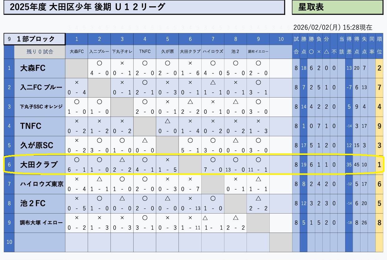 ステータス 実施中 大田区U12リーグ優勝しました! 2025年度 2025年度大田区後期U12リーグで、優勝しました!選手の皆さん、おめでとう!!区長杯もがんばって! ↓↓↓同じ写真を協会HPに掲載してもらいました。